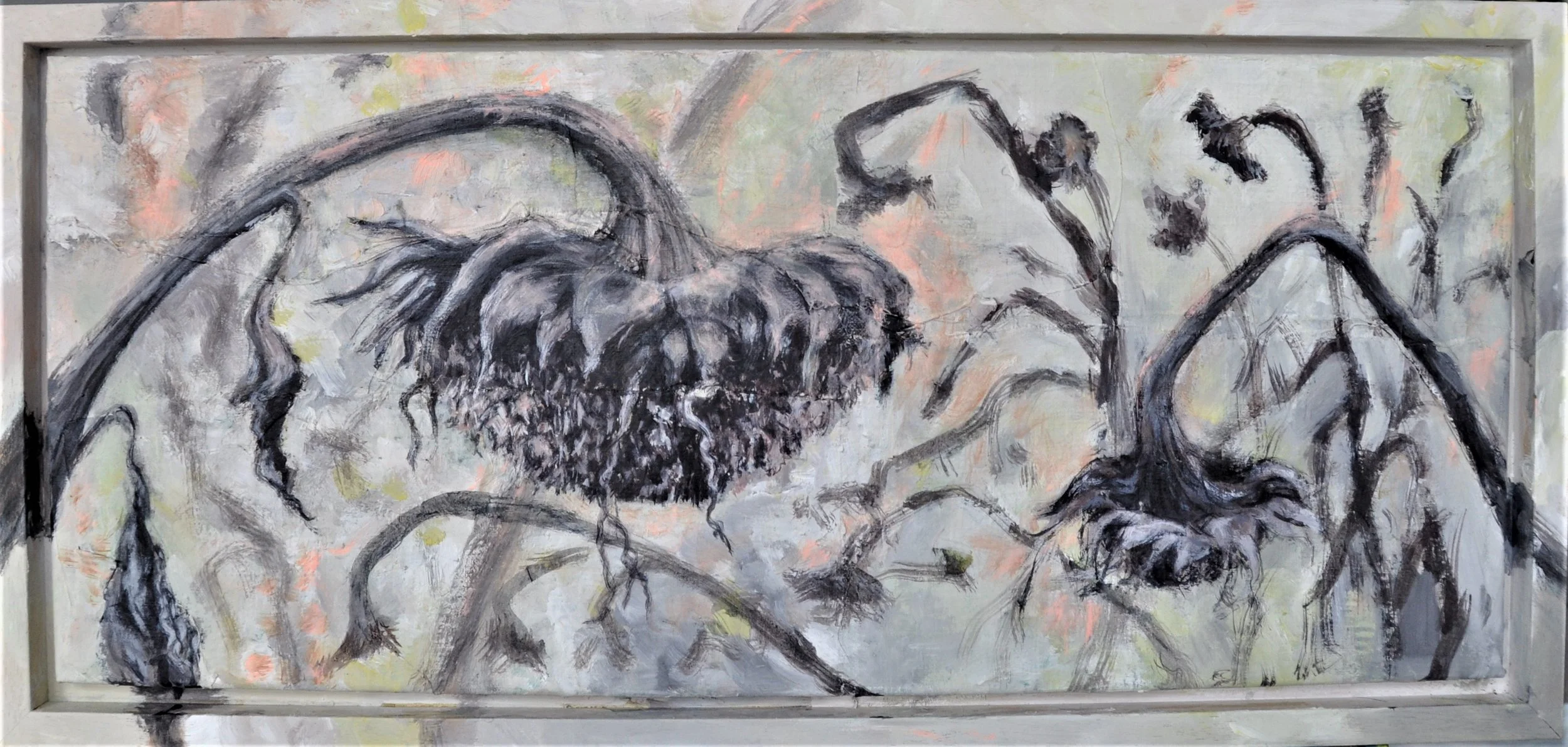 MEMENTO MORI, Mischtechnik auf altem Leintuch auf Keilrahmen, 2019, 35,5 x 75 cm mit Rahmen